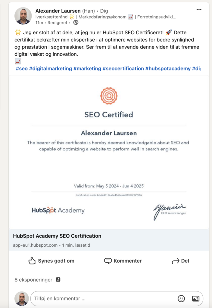Vigtigheden af personlig branding på LinkedIn: Personlig branding på LinkedIn er ikke kun et spørgsmål om selvrepræsentation; det handler om strategisk at placere sig selv i det professionelle landskab. Ved at opdatere din profil regelmæssigt med relevant og engagerende indhold, som din HubSpot SEO-certificering, demonstrerer du løbende din faglige udvikling og ekspertise. Dette skaber tillid og troværdighed blandt dine netværksforbindelser og potentielle arbejdsgivere.